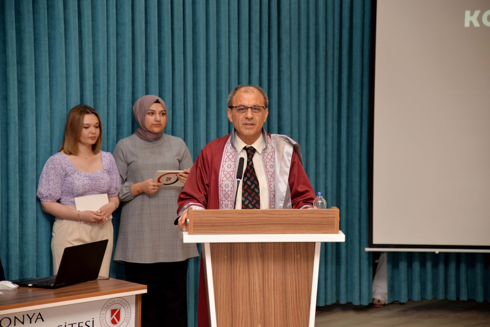 Öğrencilere seslenen Rektörümüz “Biliyorum ki bugün Anadolu’nun ortasında Selçuklu Devleti’nin başkenti sayısız bilim adamı yetiştirmiş, bilim ve kültür merkezi Konya’da öğretim hayatınızı tamamlayıp mesleğinize adım atmanın heyecanını yaşıyorsunuz. Bu bizler içinde büyük bir gurur kaynağıdır. Burada aldığınız çağdaş, modern ve idealist donanımla her biriniz önce kendiniz sonra aileniz ve son olarak ülkeniz için birer umut ışığısınız. Şimdi öğrendiklerinizi hayata geçirme zamanı. İnanıyorum ki bilimin ışığında gittiğiniz her yerde faydalı işlere imza atacaksınız. Zorluklar karşında asla pes etmeyin. Kendinizi geliştirerek üstesinden gelemeyeceğiniz hiçbir zorluk yok. Ayrıca hayatınız boyunca insanlığın temel değerlerinden ayrılmayın, ilkelerinizden taviz vermeyin. Sahip olduğunuz görev ve sorumluluk bilincinden asla ama asla ödün vermeyin, kendiniz ve milletiniz için var gücünüzle çalışın. Sizler geleceğimizin mühendislerisiniz hayal gücünüzü geliştirmek için kendinizi sürekli yenilemeniz gerekmektedir bunu asla ihmal etmeyin. Bizler eğitim-öğretim hayatınız boyunca nasıl yanınızdaysak meslek hayatınız boyunca da her zaman yanınızda ve destekçiniz olmaya devam edeceğiz” dedi.
