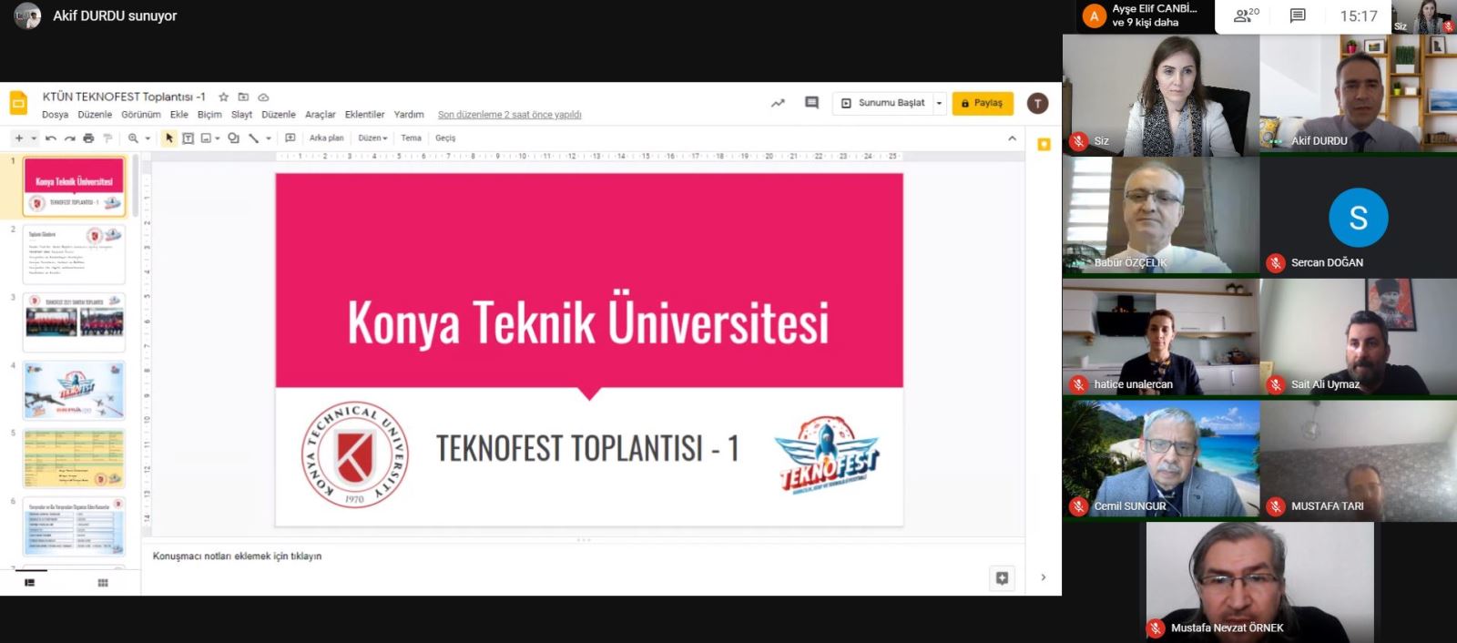 KTÜN TEKNOFEST Koordinatörü Doç. Dr. Akif Durdu moderatörlüğünde ‘KTÜN TEKNOFEST Bilgilendirme Toplantısı’nın ilki online olarak takım danışmanlarının katılımıyla gerçekleşti. Rektör Prof. Dr. Babür Özçelik’in de katıldığı toplantıda TEKNOFEST süreci, Konya Teknik Üniversitesi adına katılacak takımların durumu, yarışmalarla ilgili beklentiler hakkında değerlendirmede bulunuldu.