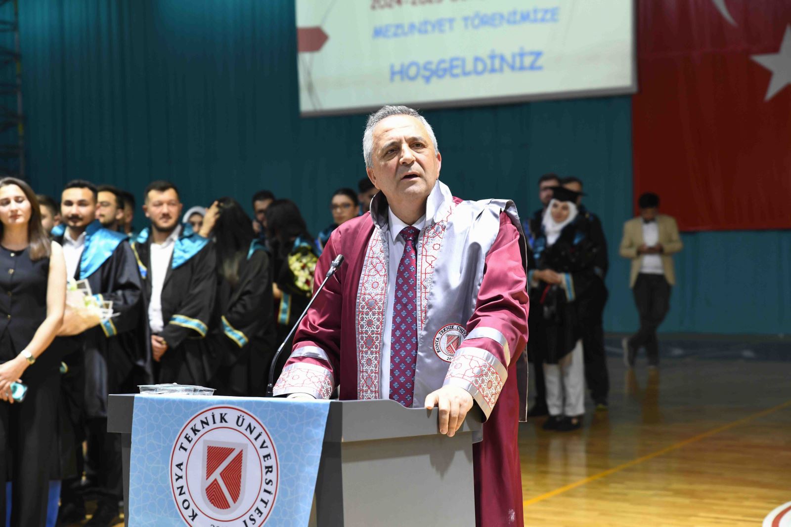 Mezuniyet töreninde konuşan KTÜN Rektörü Prof. Dr. Osman Nuri Çelik, mezun olan öğrencilerin büyük bir azim ve emekle bu noktaya geldiğini vurgulayarak, şunları söyledi, “Zorlu ama bir o kadar da kıymetli bir yolculuğu başarıyla tamamladınız. Her birinizi gönülden tebrik ediyorum. Bu başarı yalnızca siz değerli öğrencilerimizin değil, aynı zamanda sizlere inanan, her adımınızda yanınızda olan ailelerinizin, sizleri bilgiyle donatan hocalarınızın ve destek veren tüm üniversite camiamızın ortak gururudur.” dedi.