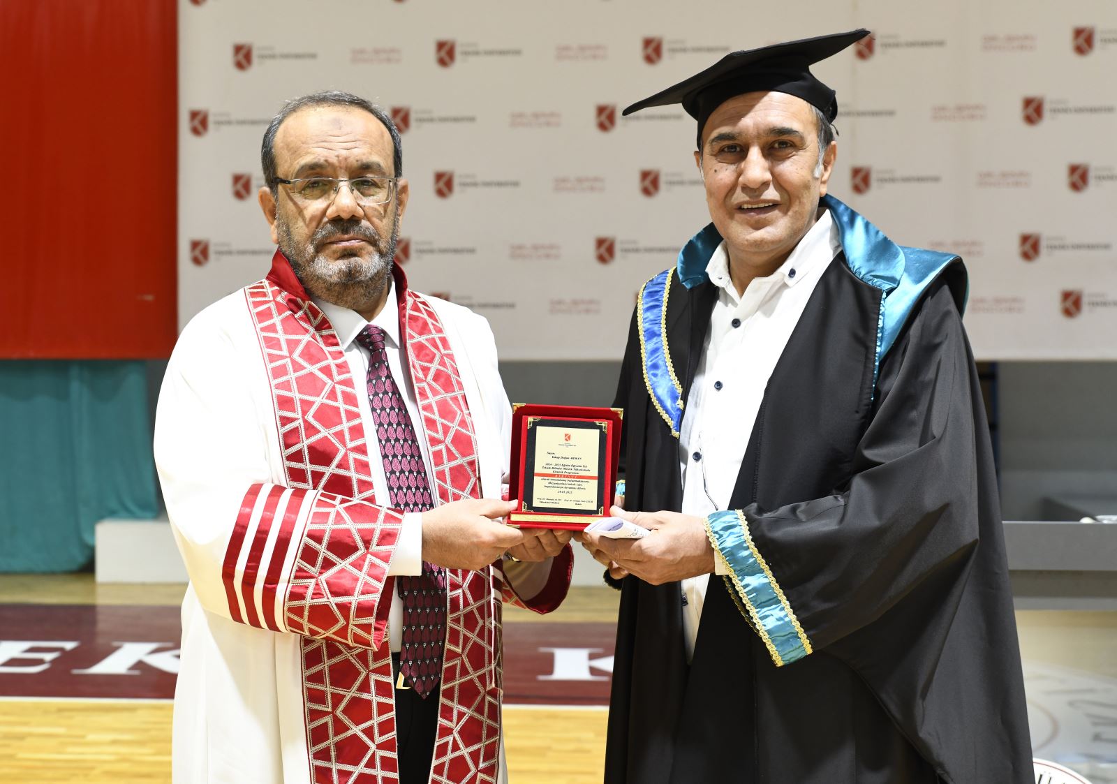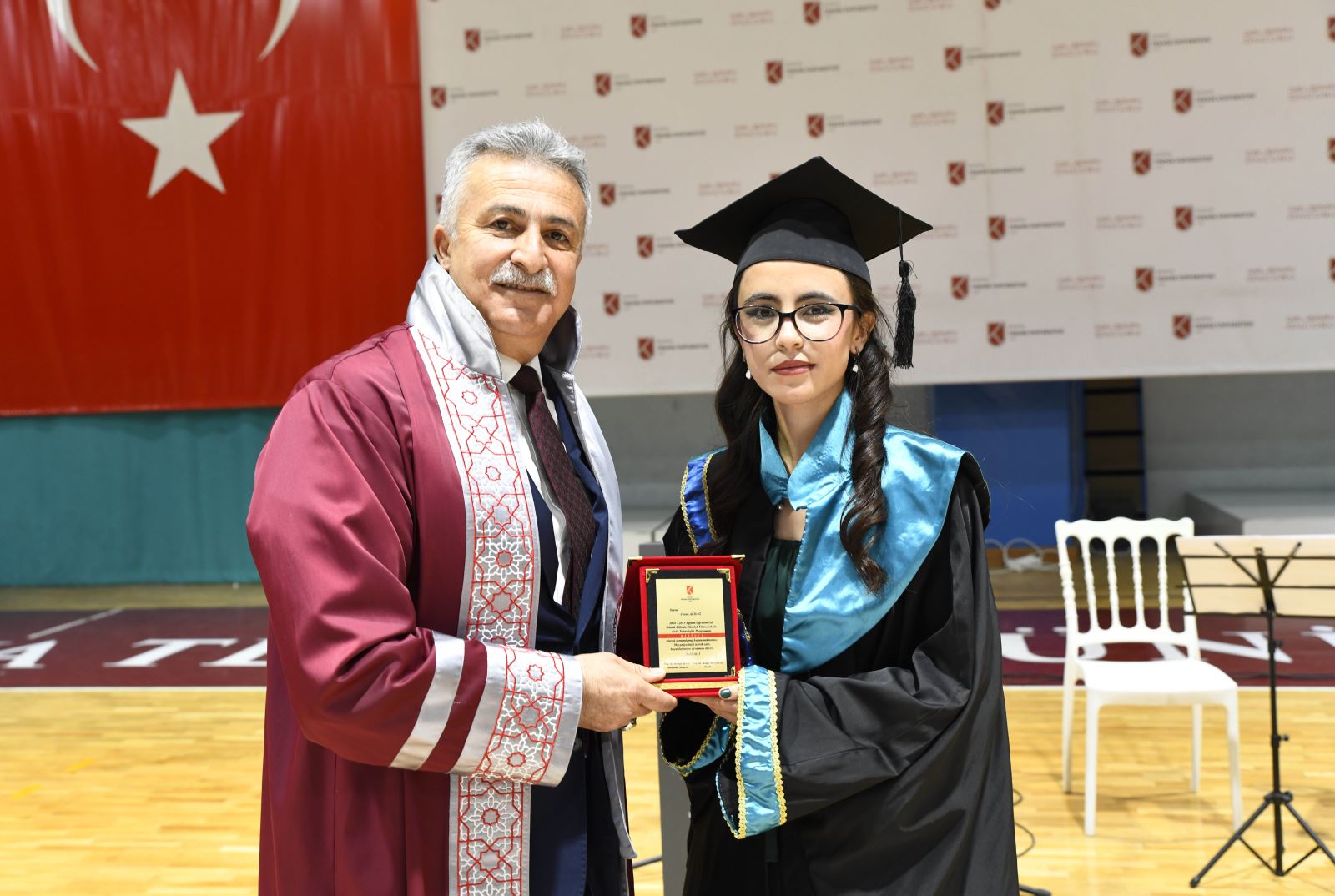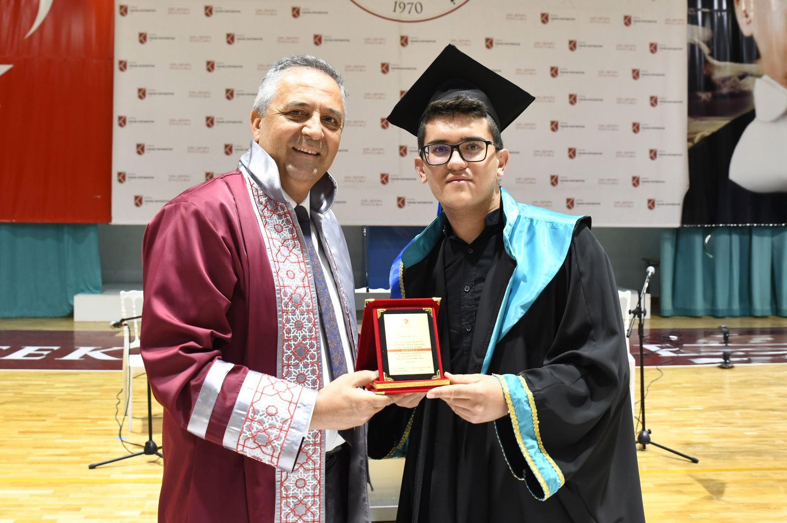 KTÜN TBMYO Elektrik Bölümü öğrencisi olarak 52 yaşından okul 1’incisi olarak mezun olan, Yakup Doğan Akman yaptığı konuşmada, “Bu yaşta yeniden okul sıralarına dönmek cesaret isterdi. Ama gençlerle birlikte mezun olmak, onların heyecanına ortak olmak, bana hayatım boyunca unutamayacağım çok özel bir tecrübe kazandırdı. Tecrübe kazanmanın yaşı yok. Yıllar sonra tekrar sırtıma çanta takıp kampüs koridorlarında yürümek, sınav haftalarında sabahlamak kolay olmadı. Bugün derse gitmeyecek misin, diye soran sevgili eşime ve okulun ilk gününde kokulu kalem ve silgi hediye eden kızlarıma, bana destek olan arkadaşlarıma ve hocalarıma teşekkür etmek istiyorum. Bu süreçte beraber ter döktüğümüz, birlikte güldüğümüz ve dertleştiğimiz genç arkadaşlarıma teşekkür ediyorum. Hep birlikte başardık, birlikte mezun olduk. Hepimizin yolu açık olsun” dedi.