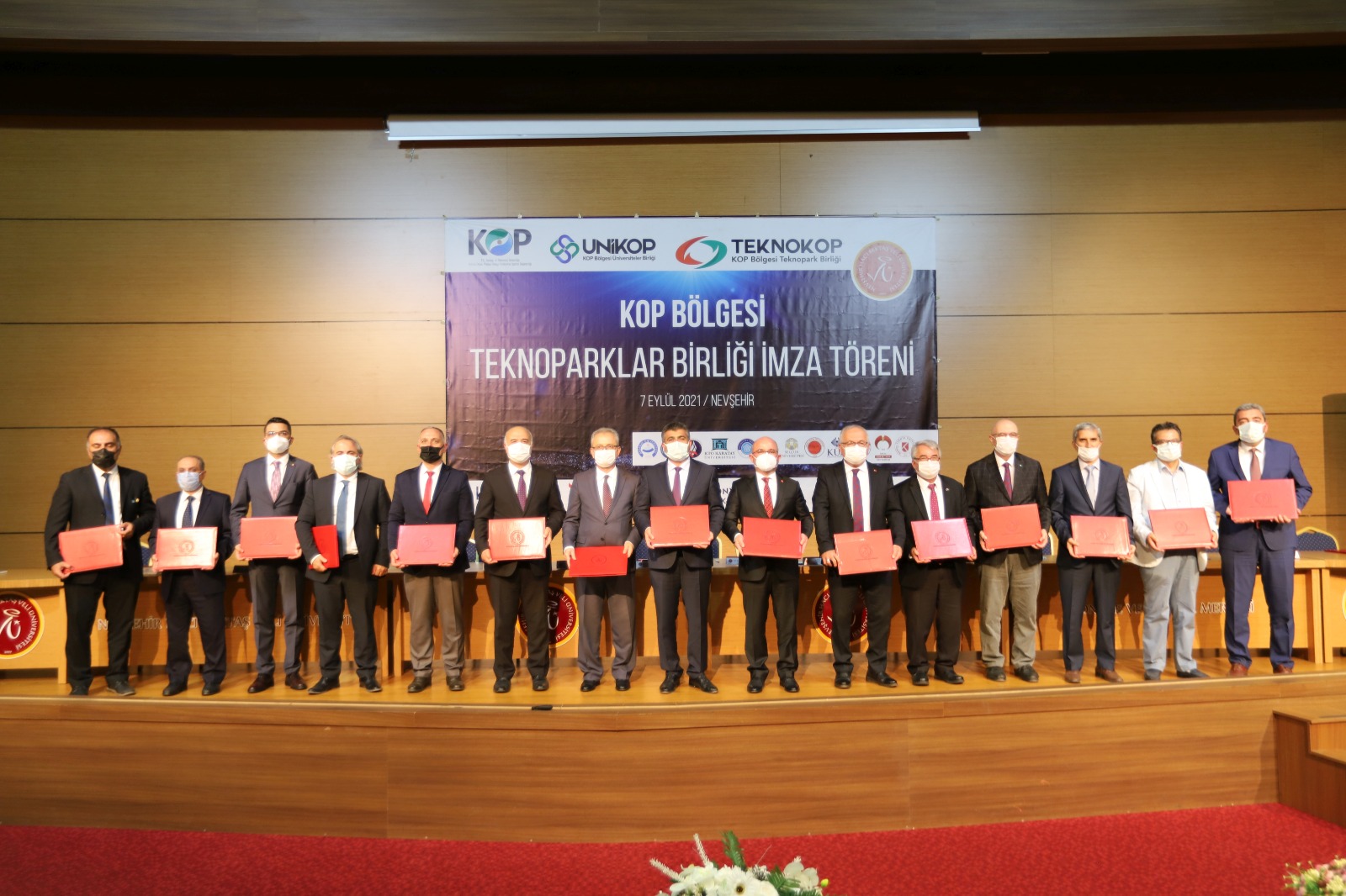 ÜNİKOP 2021 dönem başkanlığı olan Nevşehir Hacı Bektaş Veli Üniversitesi (NEVÜ) Kapadokya Teknopark ev sahipliğinde gerçekleşen törende atılan imza ile KOP Bölgesi Teknoparklar Birliği resmen kuruldu. Birlik, KOP bölgesinde faaliyet gösteren Teknoloji Geliştirme Bölgesi Yönetici şirketleri ve Teknoloji Transfer Ofisleri arasında iş birliği geliştirmek, KOP bölgesi teknoparklarında faaliyet gösteren işletmeler, girişimciler, bu bölgelerde yürüyen projeler ve teknoloji transfer ofisleri arasındaki iş birliklerini artırmak, Bölgeler arasında iyi uygulama örneklerini yaygınlaştırmak, Ortak projeler geliştirmek, Ortak araştırma ve geliştirme çalışmaları ve etkinlikler düzenlemek, Üniversite ile sanayi iş birliğini daha etkin bir biçimde uygulamak adına, iyi uygulama örneklerini yaygınlaştırmak, Üniversite ve sanayi iş birliğinin sağlanması noktasında mevcut bilgi ve teknoloji paylaşımını kolaylaştırmak, üniversitelerin alt yapı imkânlarının (laboratuvar vb.) etkin kullanımını sağlamak, Ortak eğitim ve çalışma ziyaretleri düzenlenerek kapasite geliştirme faaliyetlerine katkılar sağlamak, Bu amaçlar için yenilikçi ve katma değeri yüksek faaliyetler gerçekleştirmek üzere çalışmalar yürütecek.