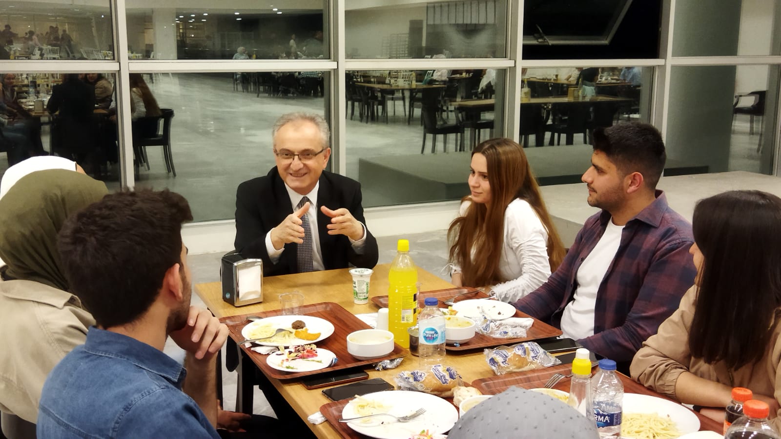 Gelişim Yerleşkesinde yer alan yemekhanede, iftar saatini bekleyen öğrencilere afiyet olsun dileklerinde bulunan Rektörümüz Prof. Dr. Babür Özçelik, “Ramazan ayında öğrencilerimizle iftar sofralarında yeniden buluşmak ve onlarla aynı masada orucumuzu açmak bizleri çok mutlu etti. Keyifli bir sohbet ortamında güzel bir iftar yaptık" dedi.