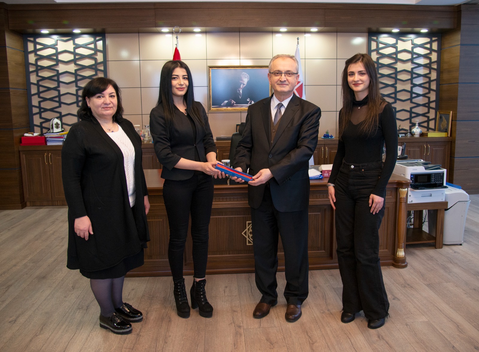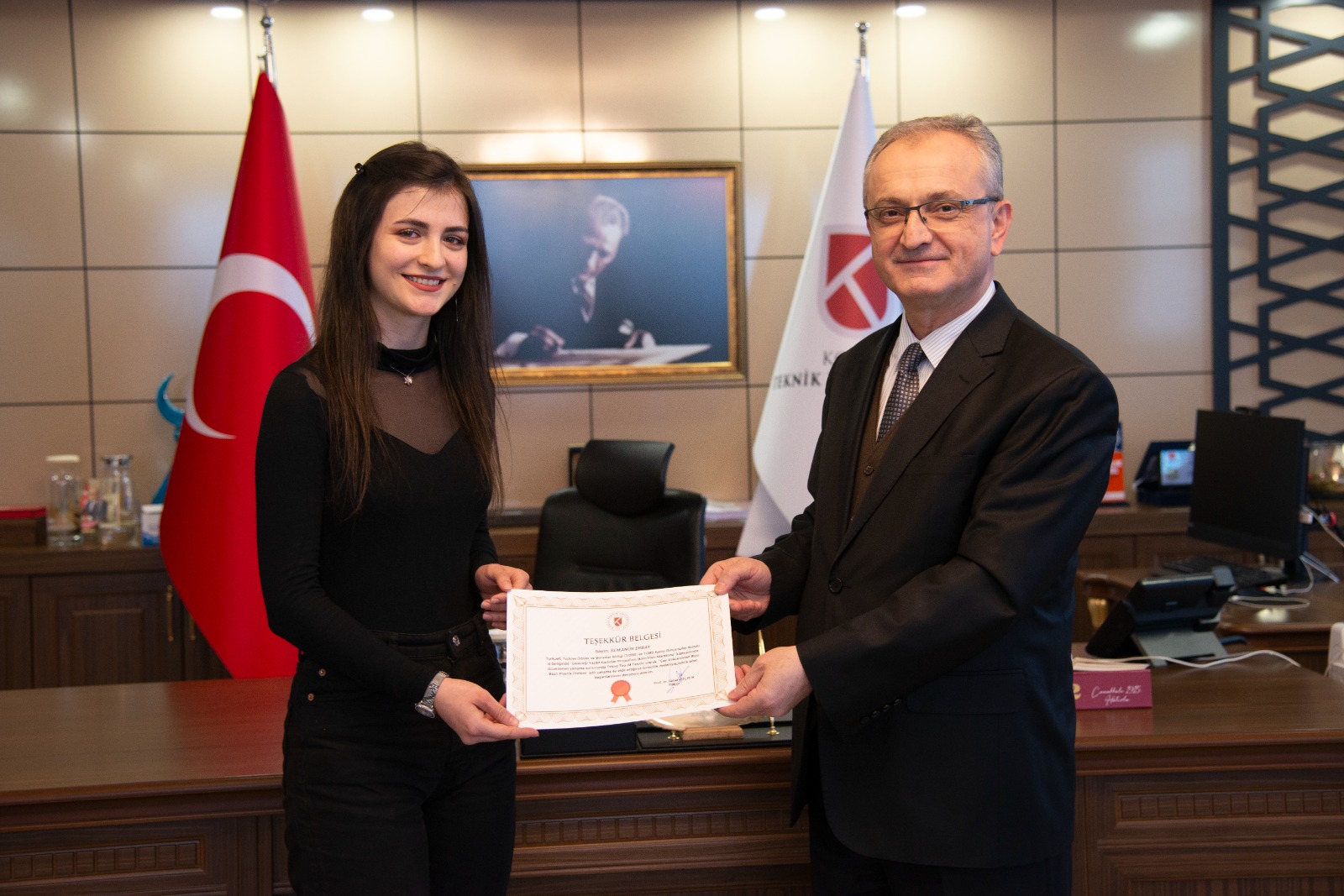 KTÜN Rektörlük makamında gerçekleşen görüşmede,  KTÜN Mühendislik ve Doğa Bilimleri Fakültesi Kimya Mühendisliği Öğretim Üyesi Prof. Dr. Gülnare Ahmetli’nin danışmanlığında projeyi hazırlayan Tekno Tea-M Takımı üyelerinden Kimya Mühendisliği Bölümü Yüksek Lisans öğrencisi Nimet Özmeral, Makine Mühendisliği Bölümü 3. sınıf öğrencisi Semanur Erbay yer aldı.