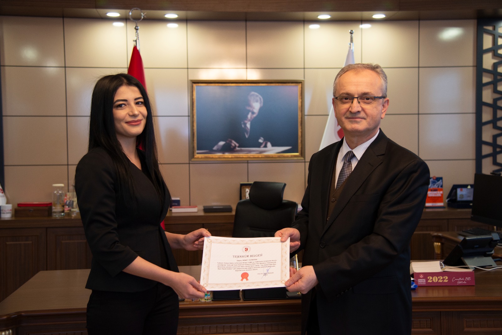 Görüşmede, Konya’nın ve Konya Teknik Üniversitesinin gururu olduklarını dile getiren Rektörümüz Prof. Dr. Babür Özçelik ise öğrencilerini ve hocalarını başarılarından dolayı tebrik ederek, “Plastik ürünlerinde dışa bağımlılık ülkemiz ekonomisinde önemli bir yer tutuyor. Hammadde miktarının azalmasında atıkların yönetimi ve ekonomiye kazandırılması konusunda öğrencilerimizin proje hazırlaması ve ödül almaları bizleri gururlandırdı. Öğrencilerimizi bu konuda yapacakları farklı projeler için laboratuvar ve teçhizat noktasında her türlü desteği sunmaya hazırız. Sektörün ve kamu kuruluşlarımızın desteği de bu girişimci projeler için oldukça önem arz ediyor.” dedi. Rektörümüz ardından öğrencilere ‘Teşekkür Belgesi’ sundu.