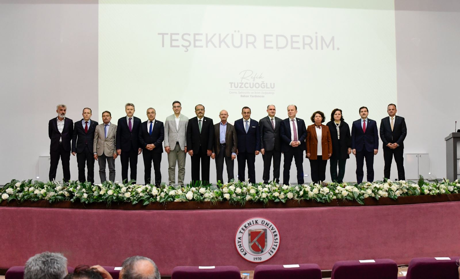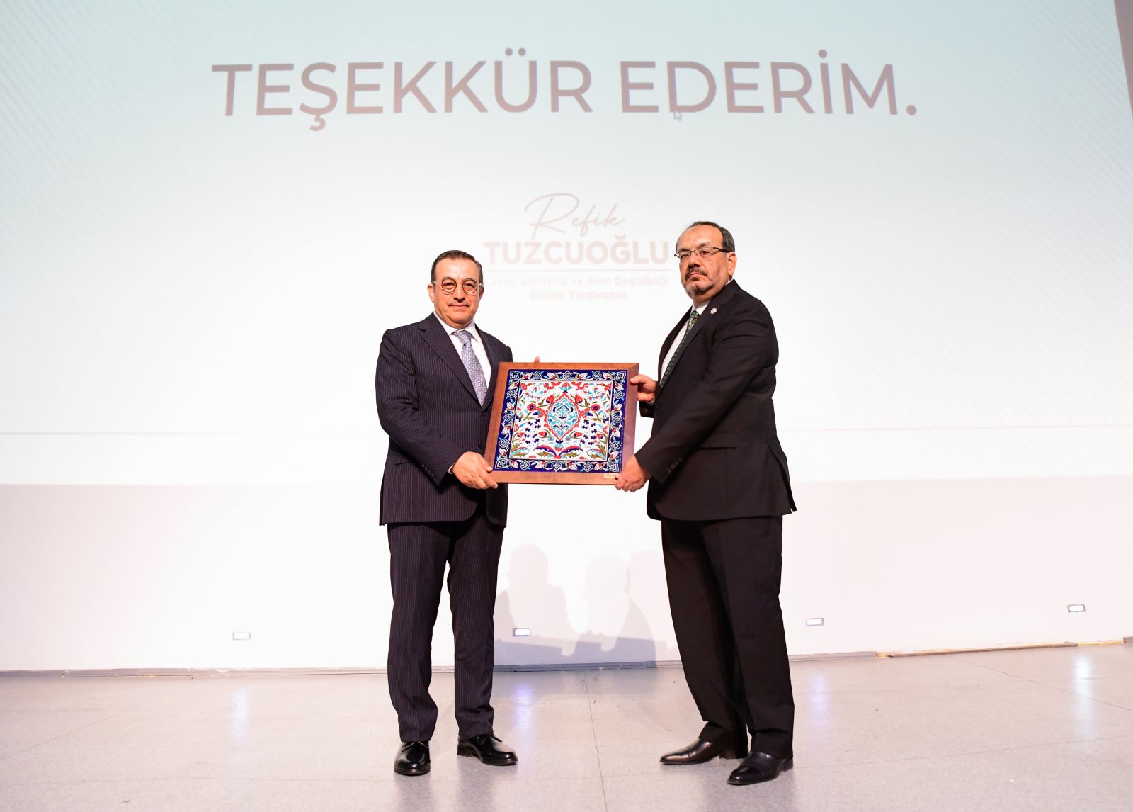 Programın sonunda Rektörümüz Prof. Dr. Osman Nuri Çelik, Çevre, Şehircilik ve İklim Değişikliği Bakan Yardımcısı Refik Tuzcuoğlu’na günün anısına plaket takdiminde bulundu.