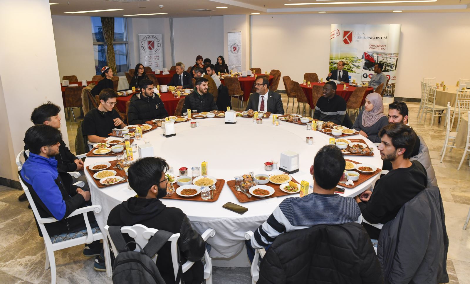 Ramazan ayının geleneksel hale getirdiği iftar buluşmalarında bu kez Uluslararası öğrencilerle bir araya gelindi. Gelişim Yerleşkesinde düzenlenen iftar yemeğine, çok sayıda Uluslararası öğrenci katıldı. İftar öncesinde kısa bir selamlama konuşması yapan Rektörümüz Prof. Dr. Osman Nuri Çelik, üniversitenin kültürel çeşitliliği destekleyen bir ortam sunduğunu belirterek, öğrencilerin hem akademik hem de sosyal açıdan gelişmelerine büyük önem verdiklerini vurguladı.