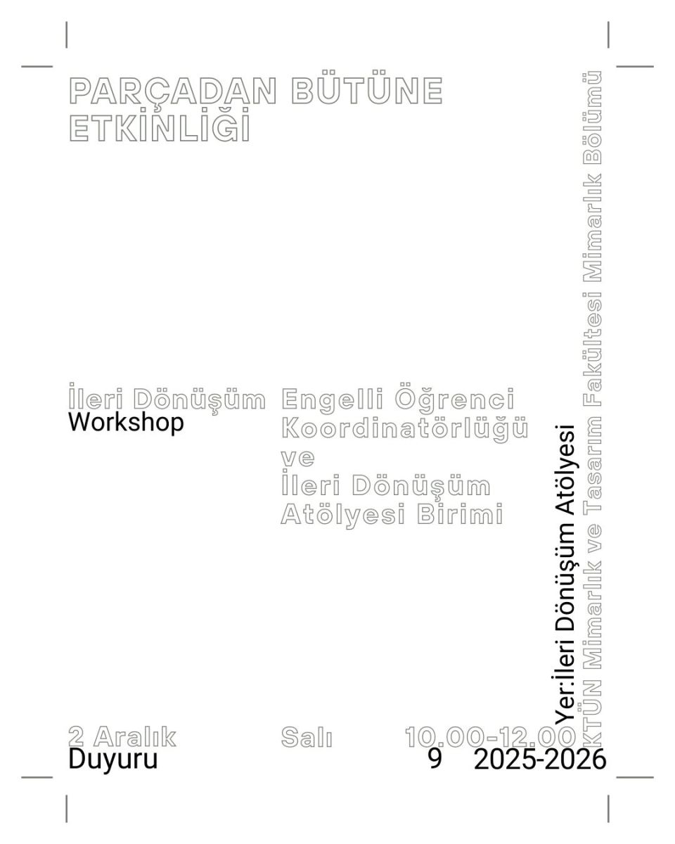 Engelli Öğrenci Koordinatörlüğü ve İleri Dönüşüm Atölyesi Biriminin düzenlediği, yürütücülüğünü Prof. Dr. Bilgehan Yılmaz hocamızın üstlendiği "Parçadan Bütüne" İleri Dönüşüm Etkinliği 2 Aralık Salı günü saat 10.00-12.00 arası Gelişim Yerleşkesi İleri Dönüşüm Atölyesinde gerçekleştirilecektir. Katılmak isteyen öğrencilerimizin Gaye Gülgen ile iletişime geçmesi gerekmektedir.
