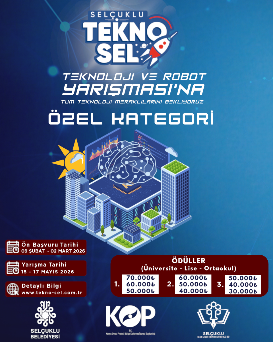 12-17 Mayıs 2026 tarihleri arasında Selçuklu Belediyesi ve Konya Ovası Projesi (KOP) Bölge Kalkınma İdaresi Başkanlığı ortaklığı TEKNOSEL Selçuklu Teknoloji ve Robot Yarışması gerçekleştirilecektir. Detaylı bilgiye aşağıdaki bağlantılardan ulaşılabilmektedir.