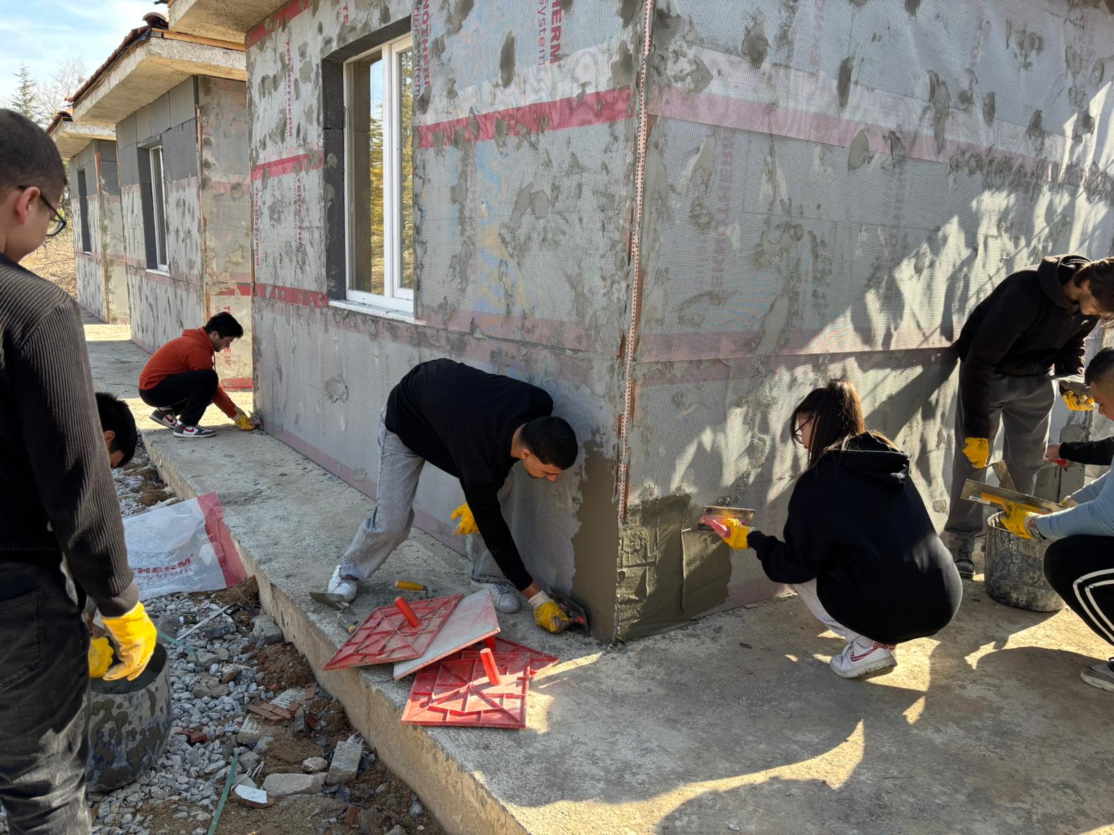 Daha önce EPS levha yapıştırma uygulaması tamamlanan dört binanın tamamında bu kez donatı filesi yerleştirilmesi ve sıva katmanının oluşturulmasına yönelik uygulamalı eğitim verilmiştir. Eğitim kapsamında öğrenciler; sıva harcının teknik şartnamelere uygun kıvamda hazırlanması, yüzeye ilk kat sıvanın uygulanması, alkali dayanımlı cam elyaf donatı filesinin doğru bindirme payları ile yerleştirilmesi ve ikinci kat sıva ile sistemin bütünlüğünün sağlanması aşamalarını sahada birebir gerçekleştirmiştir.